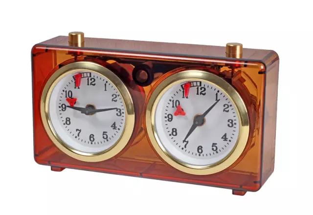 Deze klassiek vormgegeven analoge schaakklok in stijlvolle amberkleur is volledig mechanisch en werkt via een betrouwbaar opwindmechanisme — dus geen batterijen nodig. De klok beschikt over grote, goed leesbare wijzerplaten en een opvallend vlagmechanisme voor nauwkeurige tijdwaarneming. Alle bewegende onderdelen zijn zorgvuldig gefreesd uit messing of roestvrij staal, wat garant staat voor duurzaamheid en precisie. De compacte kunststof behuizing maakt de klok licht en gemakkelijk verplaatsbaar. Perfect voor gebruik op scholen, in clubs en bij toernooien.