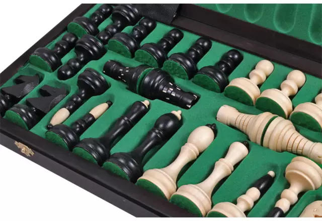 Deze slimme klassieke schaakset biedt een verfijnde variant van het traditionele schaakontwerp. De schaakstukken, hoewel klassiek in stijl, zijn slanker dan de traditionele Staunton-stijl en hebben een eigen, onderscheidend karakter. Ze zijn volledig handgemaakt en vervaardigd uit haagbeukhout, wat zorgt voor een lichte, maar stevige constructie. De schaakstukken zijn met zorg gepaint in een elegante zwarte kleur, wat bijdraagt aan de tijdloze uitstraling van de set.